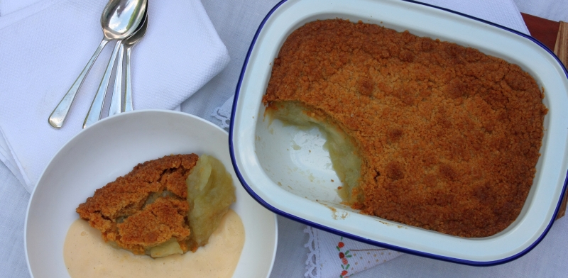 Simple food does not always mean quick to prepare, cook and serve. Simple food for me, is a celebration of natural flavours, seasonal produce, a lack of artifice and loads of love. This apple crumble takes some time to prepare – the apples are peeled, cored and sliced by hand before gently stewing – but the result is worth the time it takes. Granny Smith apples are the best choice with their tartness a real asset when made into a crumble, with its crunchy, sweet topping. There are most likely hundreds of crumble recipes, but this one is our family’s favourite. No rolled oats, no cinnamon, no almonds; just butter, flour, brown sugar and vanilla. With autumn weather bringing cool, crisp mornings, and the daylight hours shortening, the season for warm puddings is at hand. There would be a riot at our place if apple crumble was not accompanied by custard, but it’s also great with just a bit of cream or vanilla ice cream.