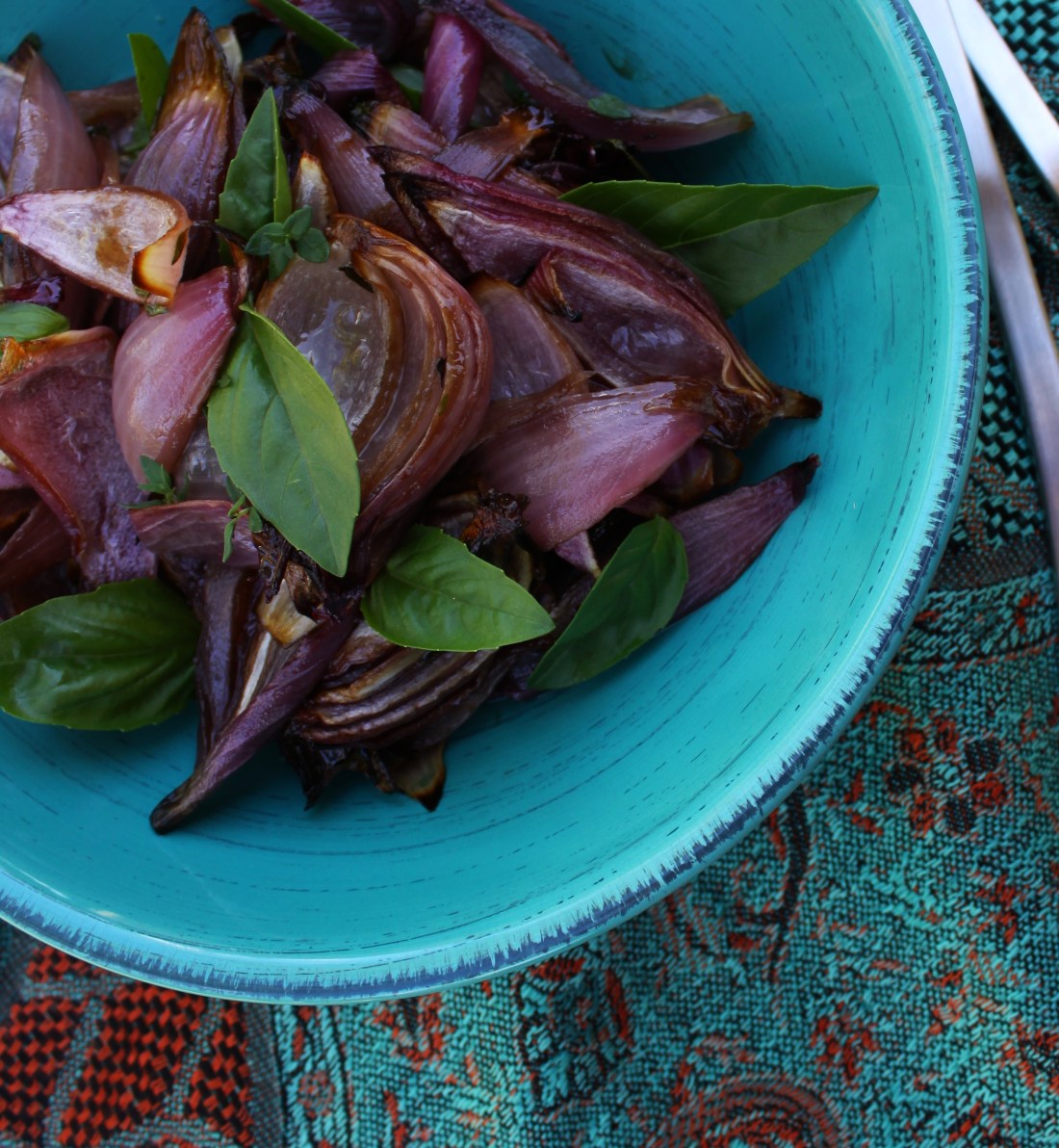 Onions are an integral part of my cooking, and their sweet, aromatic flavour adds depth and intensity to so many dishes. But in this dish they shine on their own. I saw something like this on Nigella Lawson’s Nigellisima Italian themed cooking show, and have been itching to make a version of my own ever since. We grow our own basil and at this time of year I have a ridiculous amount of this sweet, fragrant herb to use in my cooking. Even making pesto once a week does not keep on top of it, so any new recipe I can think of that uses basil is welcome. These onions are really delicious with grilled lamb or chicken and good crusty bread to soak up the juices.