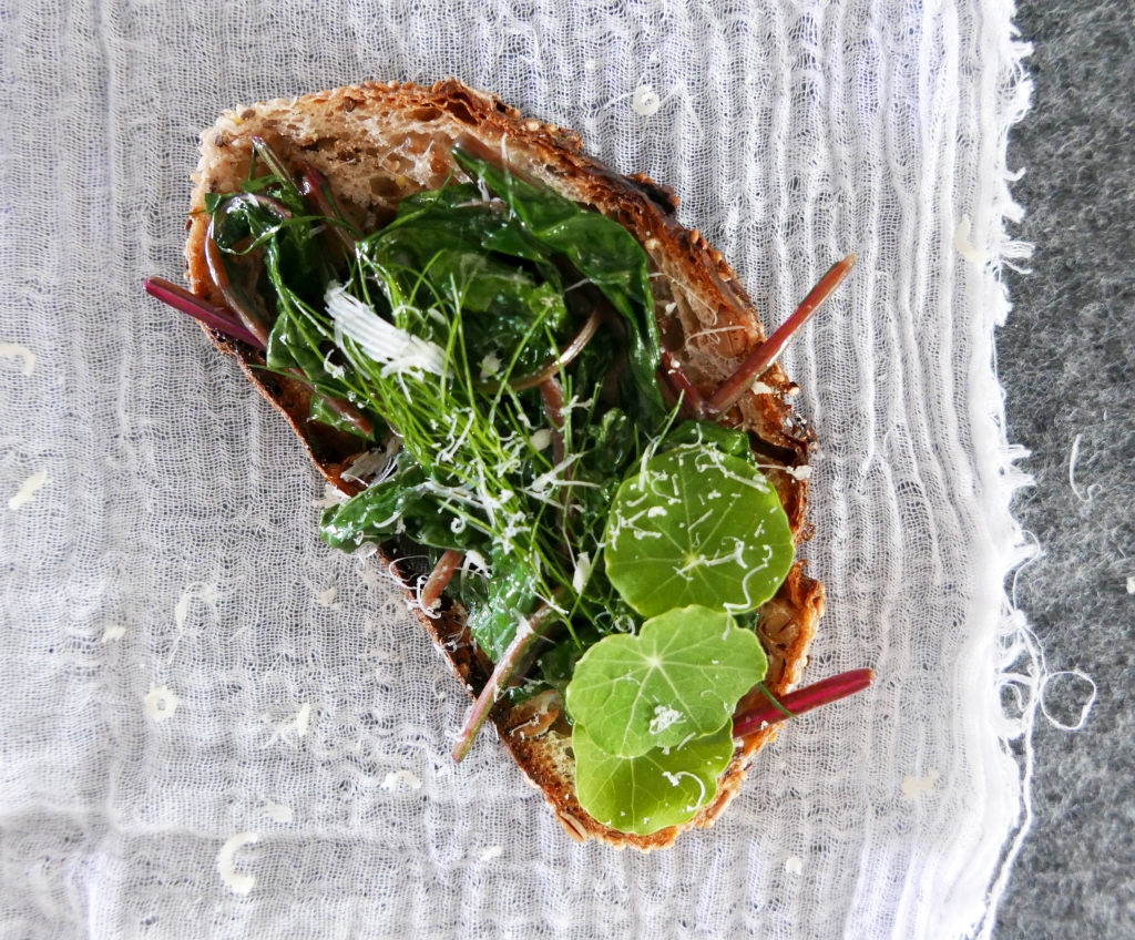 For lunch today I gathered a good handful of spinach and then foraged about for herbs – thyme, fennel fronds, parsley, baby nasturtium leaves and chives. I sauteed the spinach  and herbs in a little butter and seasoned with pepper. A slice of toasted sourdough rubbed with  a cut garlic clove was the base on which I laid the greens. A little finely grated pecorino was the final seasoning. It was deeply satisfying to make lunch from fresh produce from my own garden, and simply delicious.